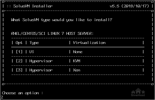 Step 2: For CentOS 7, It will show you the option to choose virtualization. Most people prefer KVM or Xen. Select your preferred virtualization by typing 2 or 3 and then press Enter. For KVM, we type 2 and then press Enter.